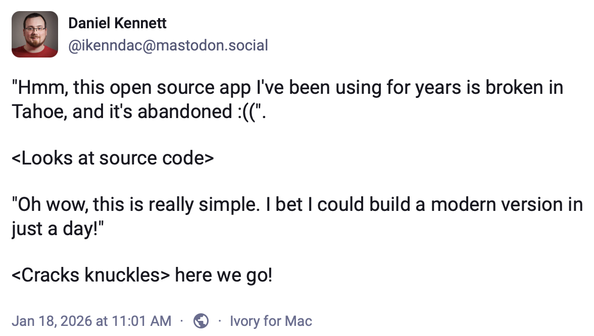 As always, I’m @iKenndac on Mastodon and am happy to chat there (although please do note my policy of ignoring unsolicited private mentions — talk to me in public!) about this — especially if you’re experienced with any of the approaches taken here. I’d love to hear your feedback!